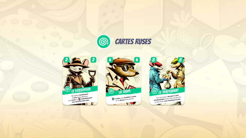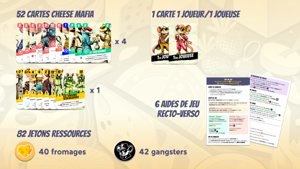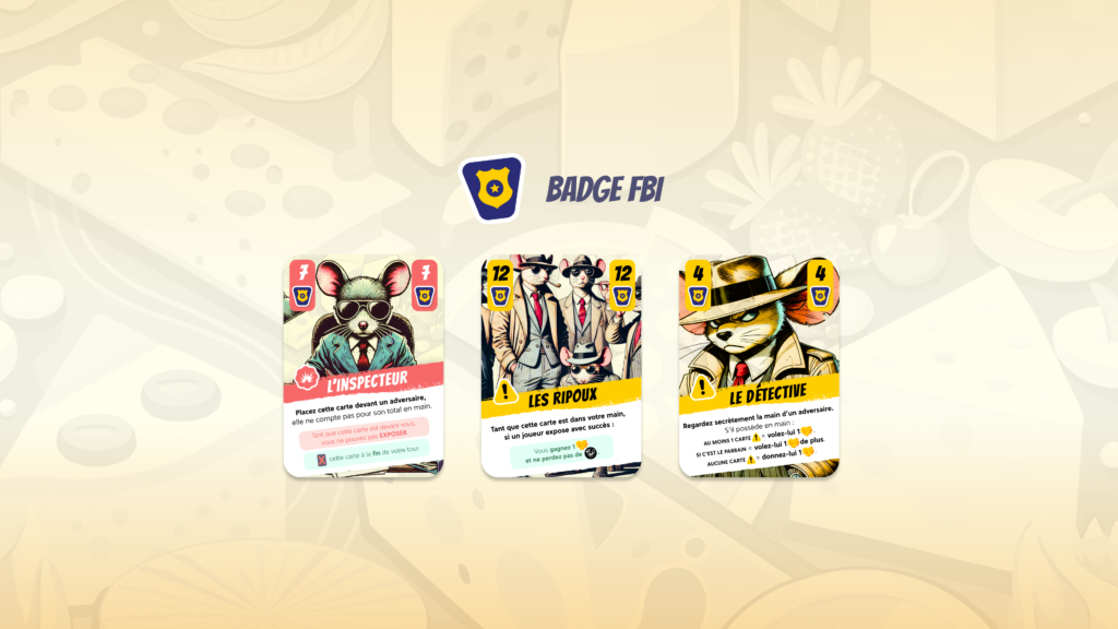 Accumulez un maximum de fromages pour remporter la partie, ou révélez 3 cartes comportant le Badge FBI !