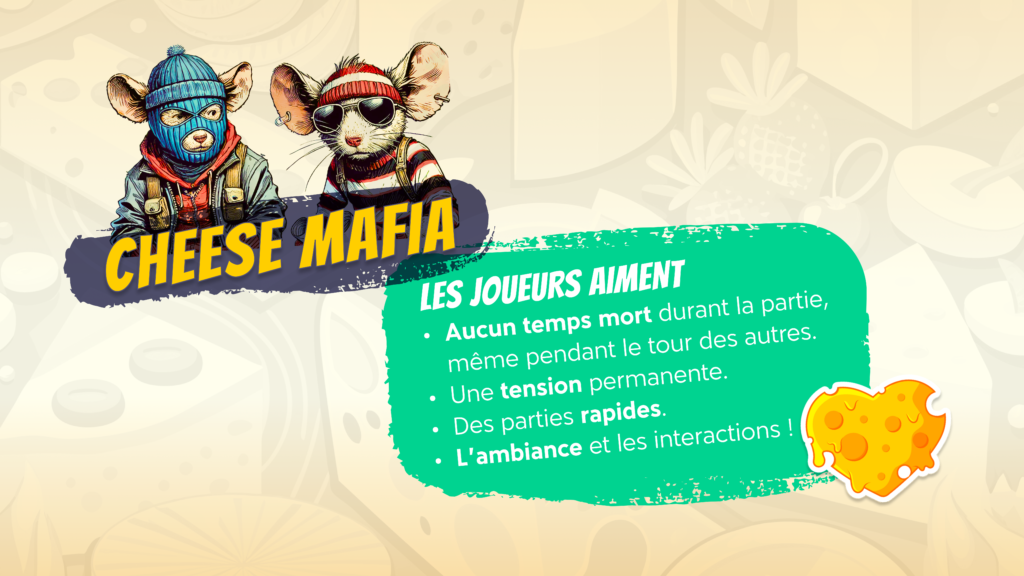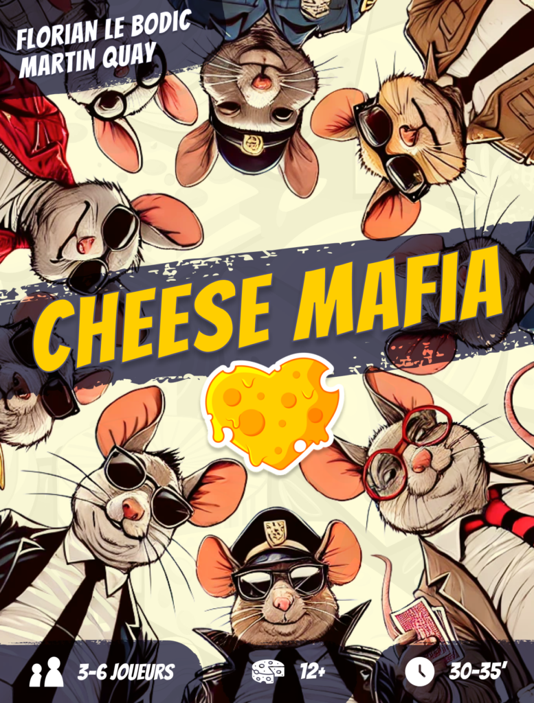 Cheese Mafia est actuellement à la recherche d’un éditeur passionné pour donner vie à ce jeu plein de fun et d’interactions. Nous comprenons et respectons le fait qu’un éditeur puisse avoir ses propres artistes et sa propre vision pour le jeu. Mais développer un univers cohérent et engageant nous tenait particulièrement à coeur pour faire vivre le jeu au fur et à mesure que les versions du prototype avançaient.